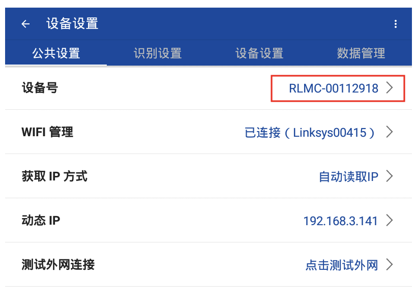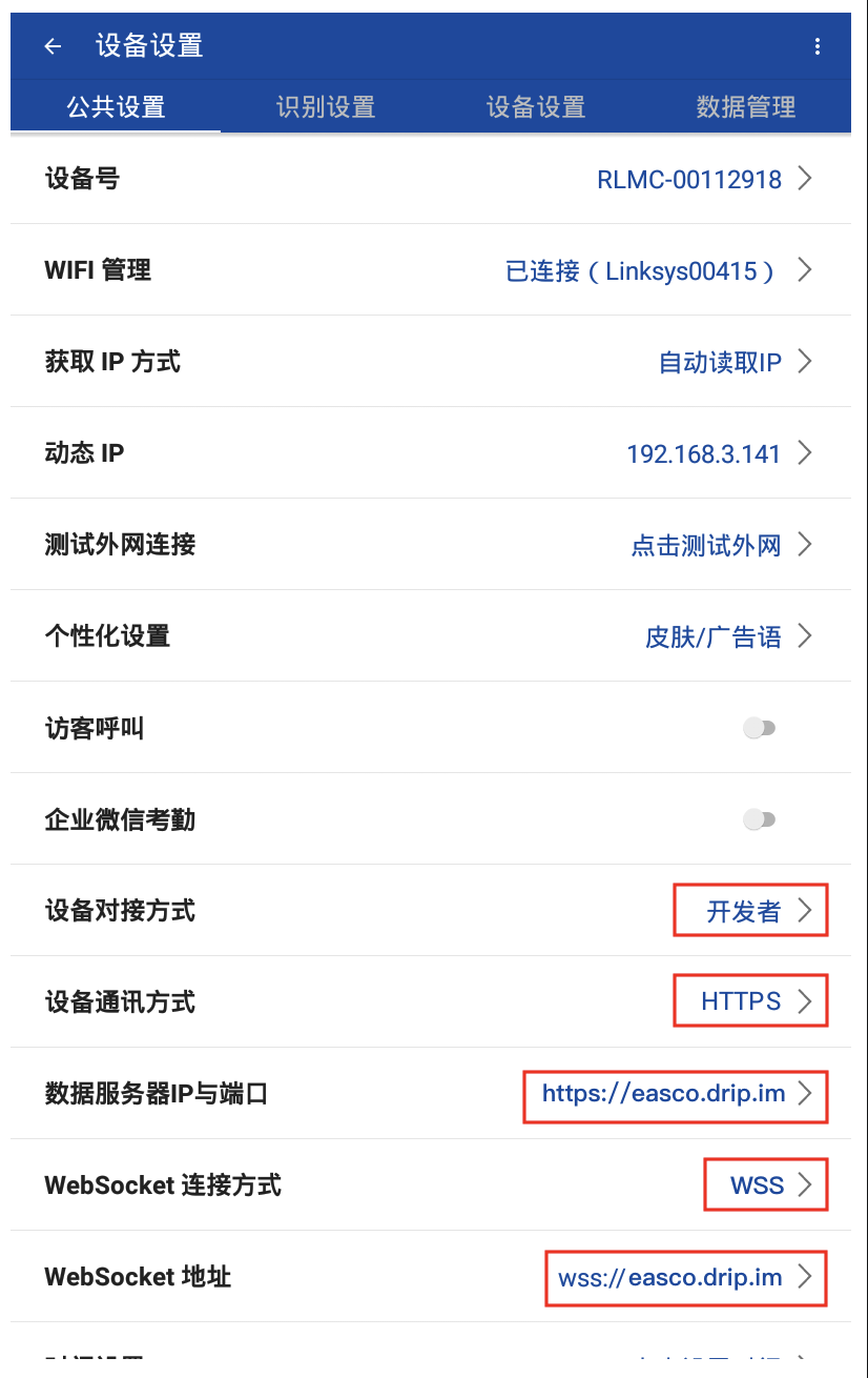 进入设备设置界面后,在公共设置中找到「设备号」,填写到「水滴智店」后台。