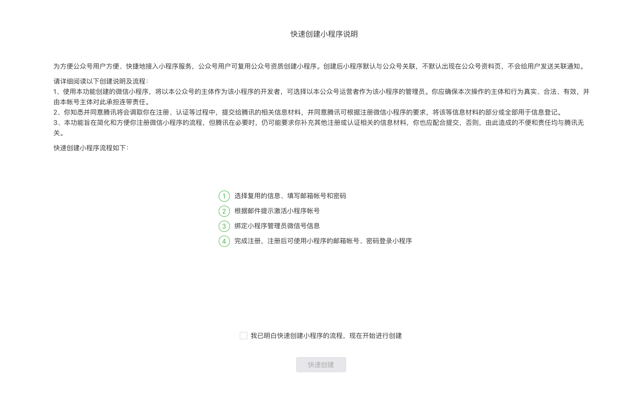 在使用平台提供的服务前,需要先注册一个小程序,授权后上传代码即可预览体验,测试无误后提交审核。