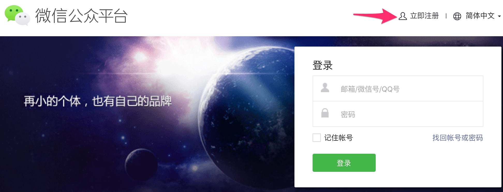 首先进入公众号后台,点击顶部的「立即注册」