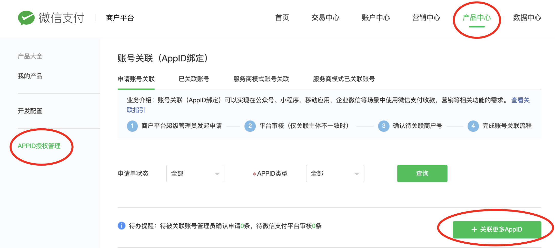 然后进入微信支付商户后台,需要管理员扫码登录,按照下图找到“关联更多AppID”按钮,添加关联刚才复制的AppID