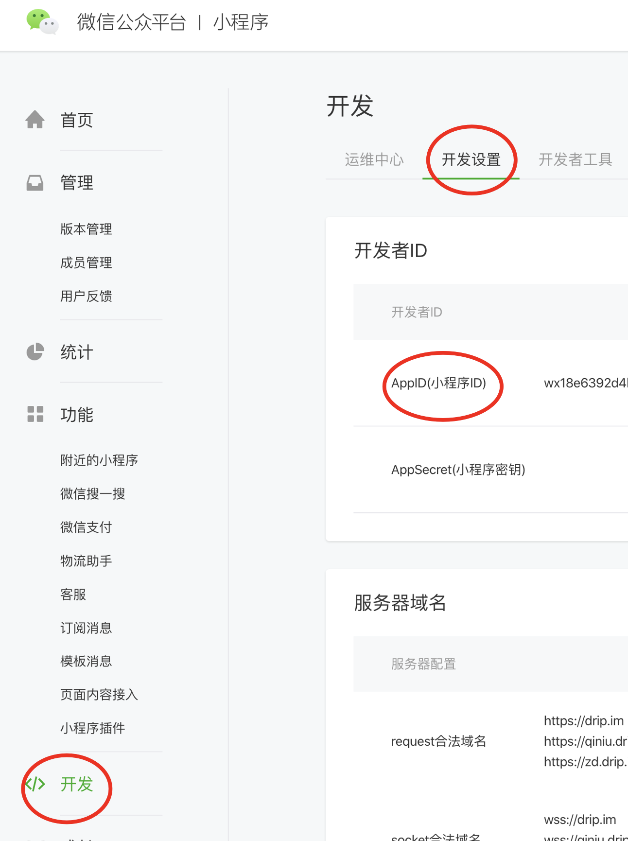 首先登陆小程序后台,按照以下图示,找到小程序的AppID