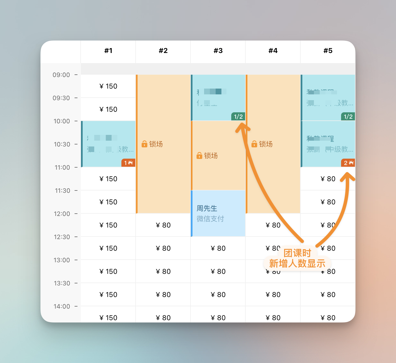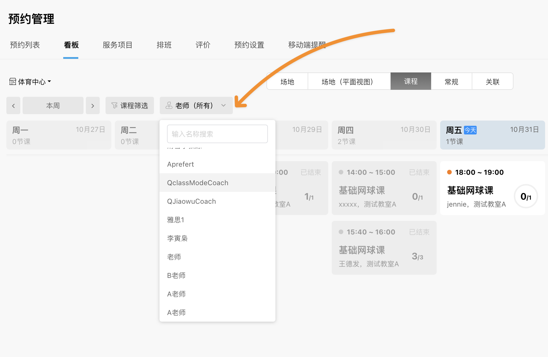 课程模式下,如果关联了场地/老师,那么在场地/老师看板上也会显示对应课程,本次新增了课程人数的进度显示。