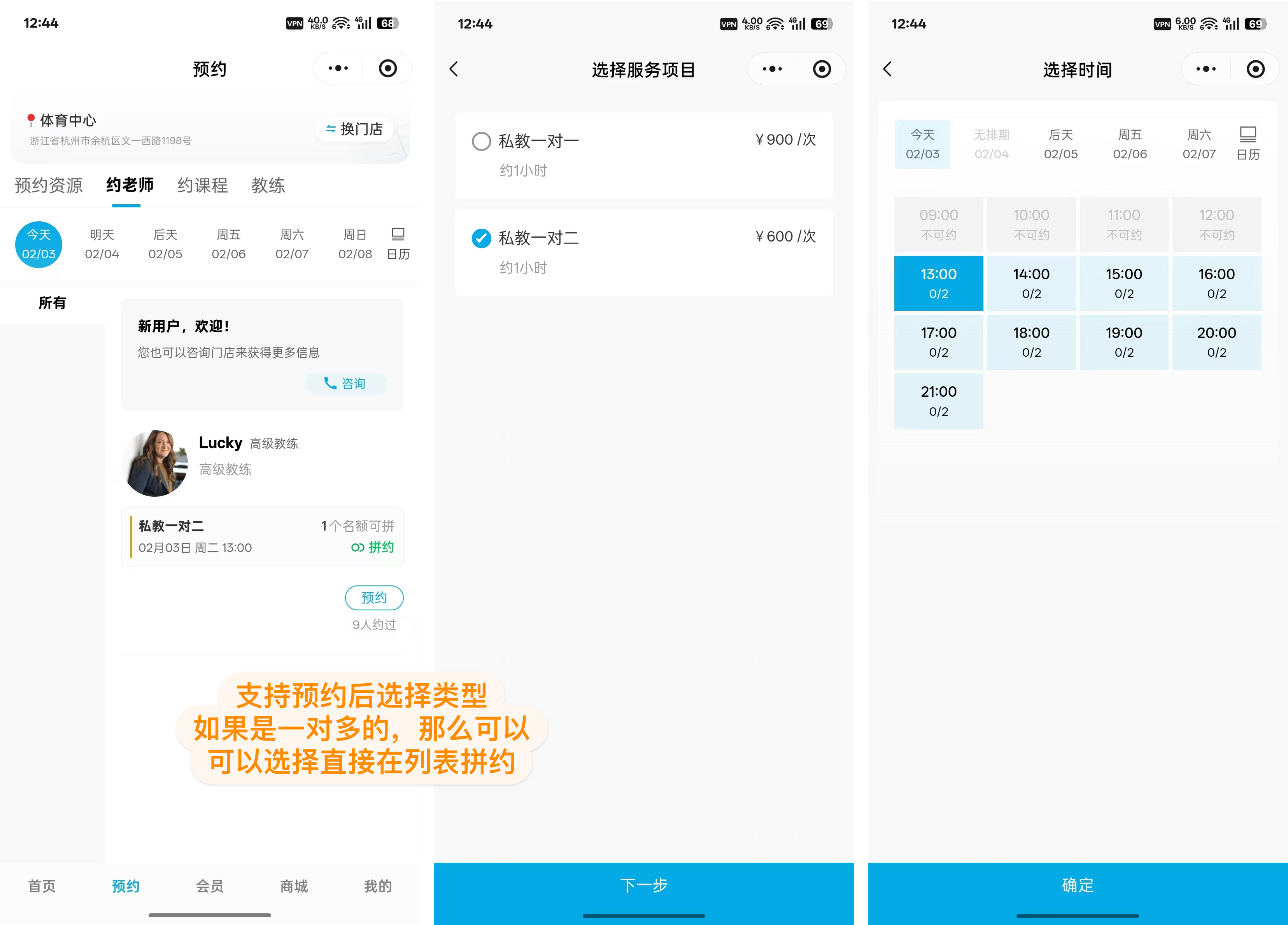 支持“1对多”人员拼团预约模式。客户可主动发起或加入拼约,共享同一时段资源(如课程、教练),有效降低人均成本并提高成团率。拼约进度实时可见,兼顾灵活性与资源利用效率。